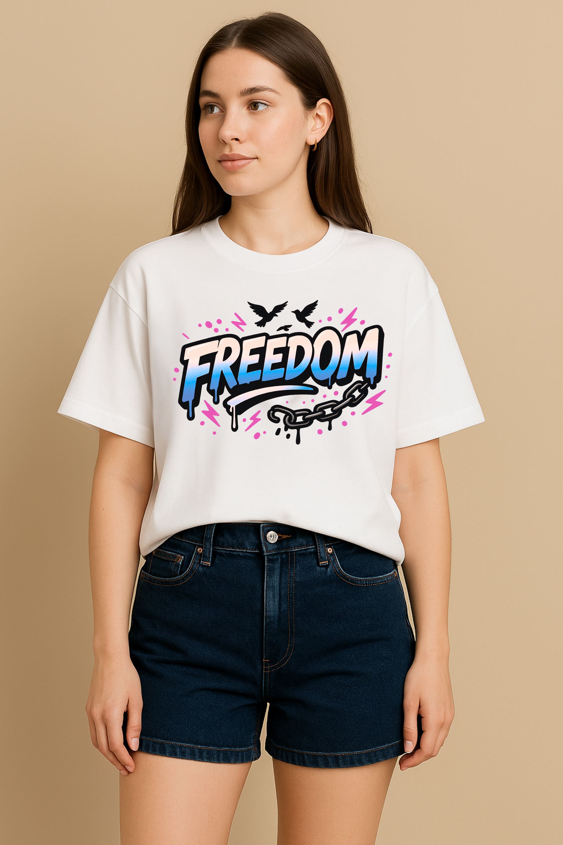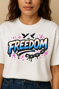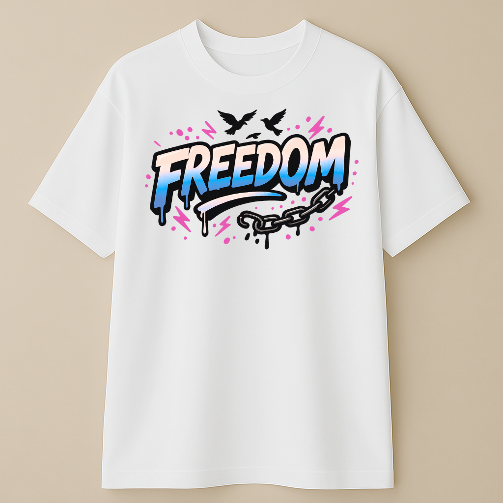 Front: Bold graffiti-style “FREEDOM” text with broken chains and soaring birds.