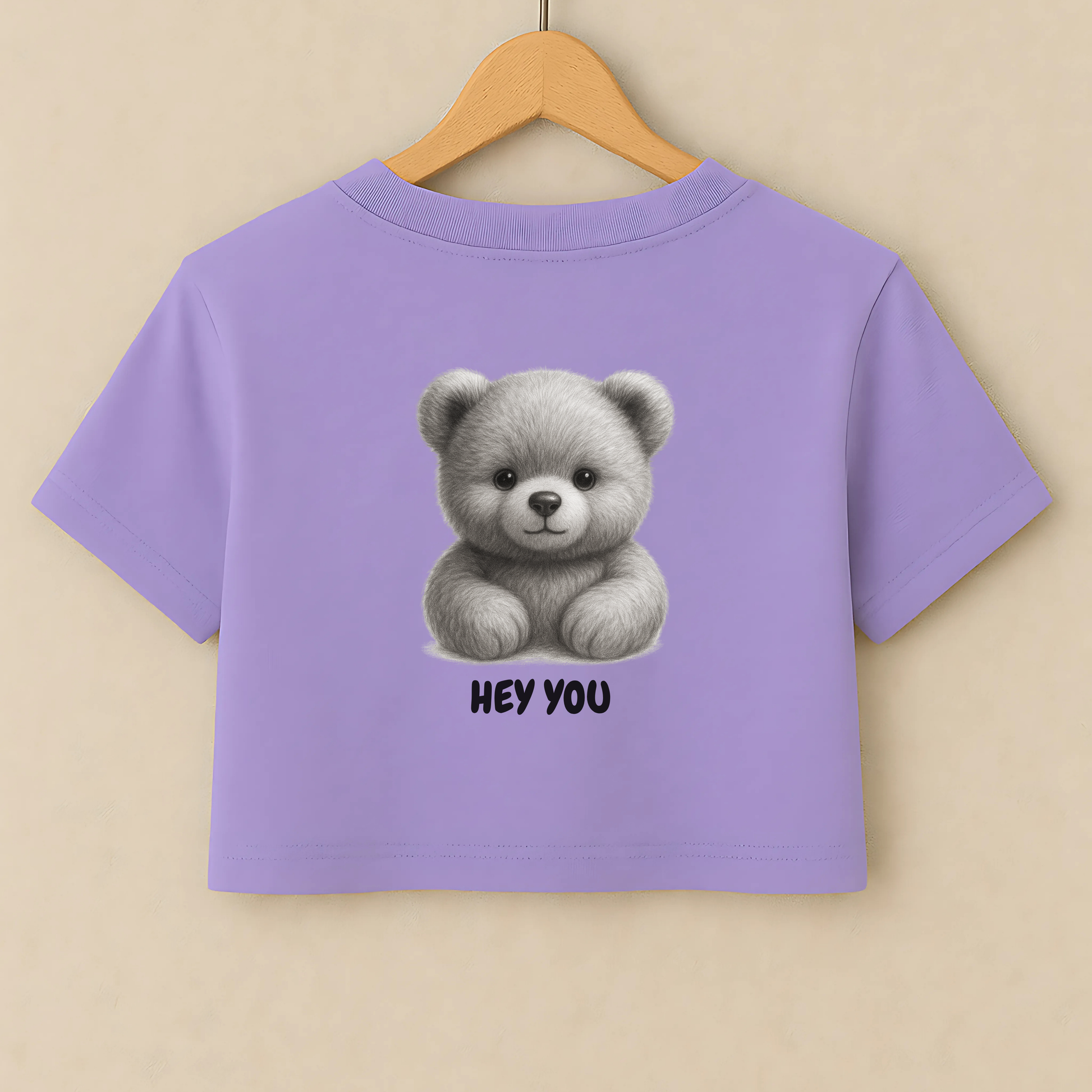 Front Graphic Design – Realistic teddy bear with soft “hey you” text