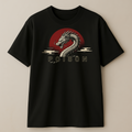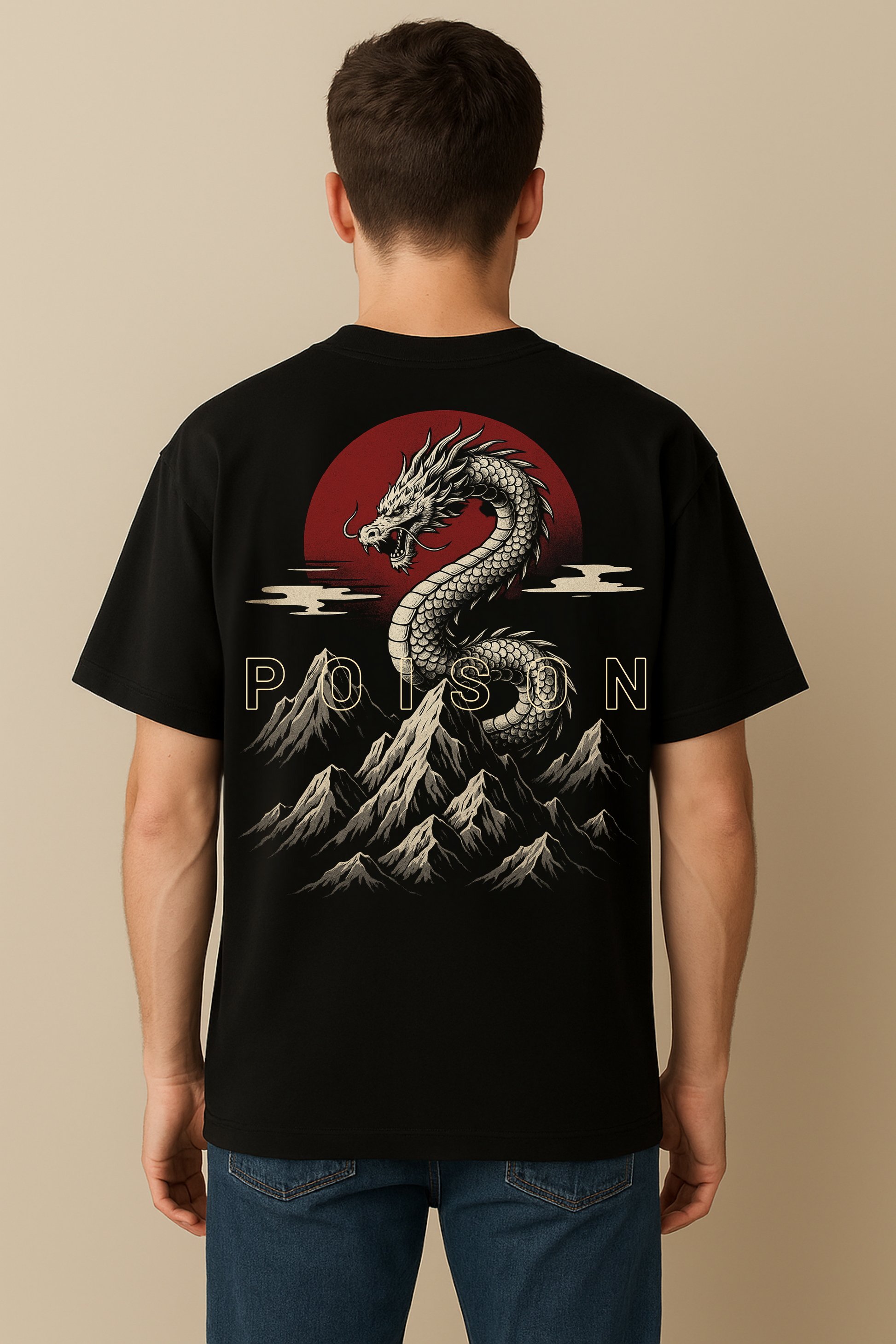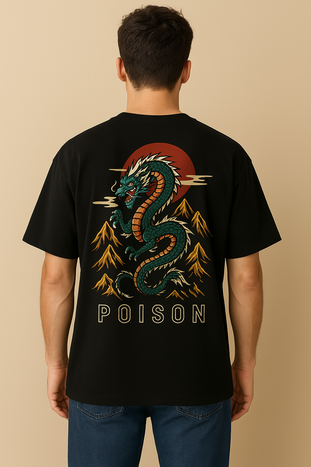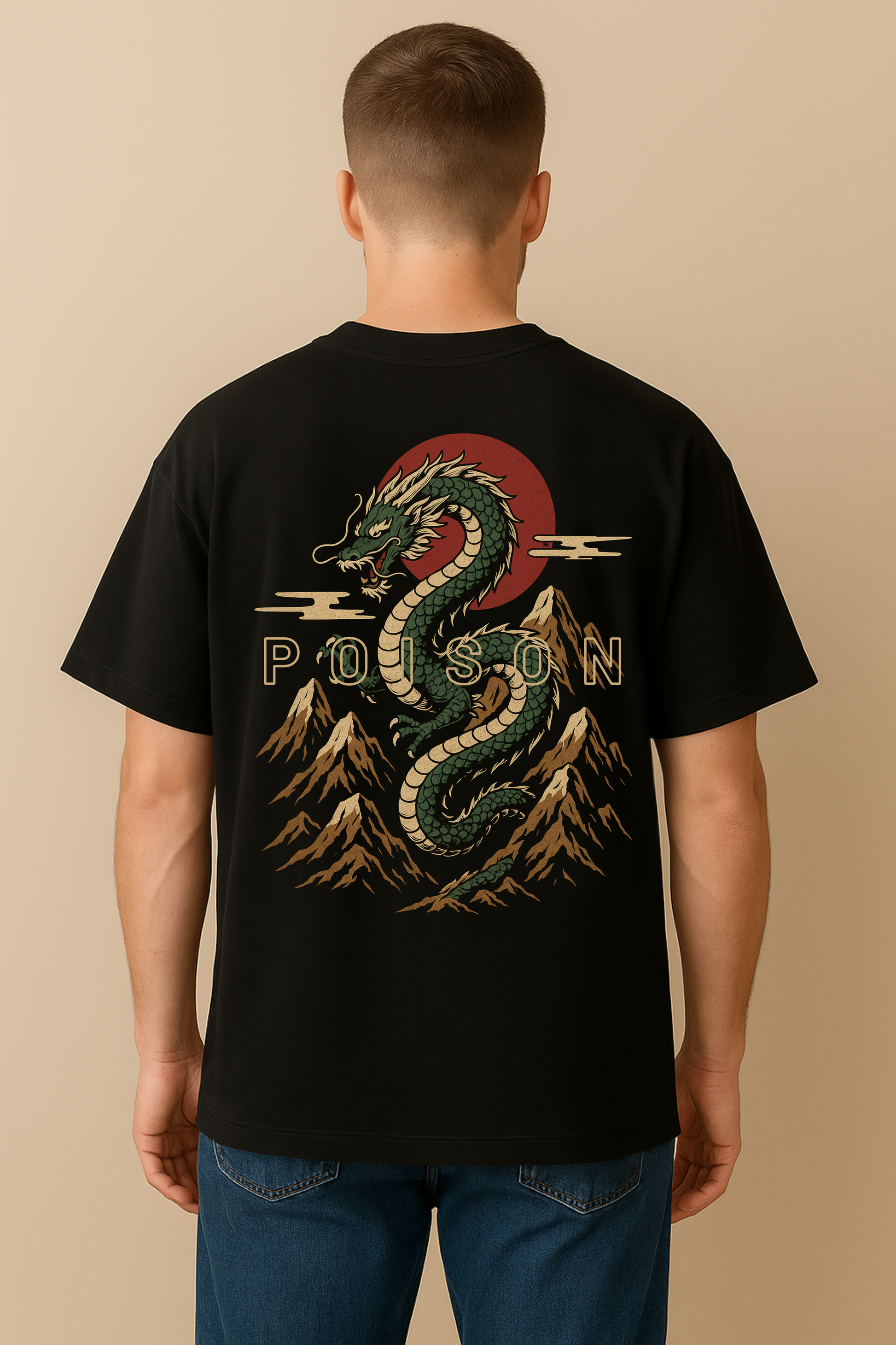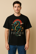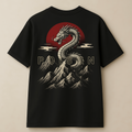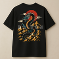"Poison Dragon" Oversized Cotton T-Shirt for Men | Red Sun & Mountain Print