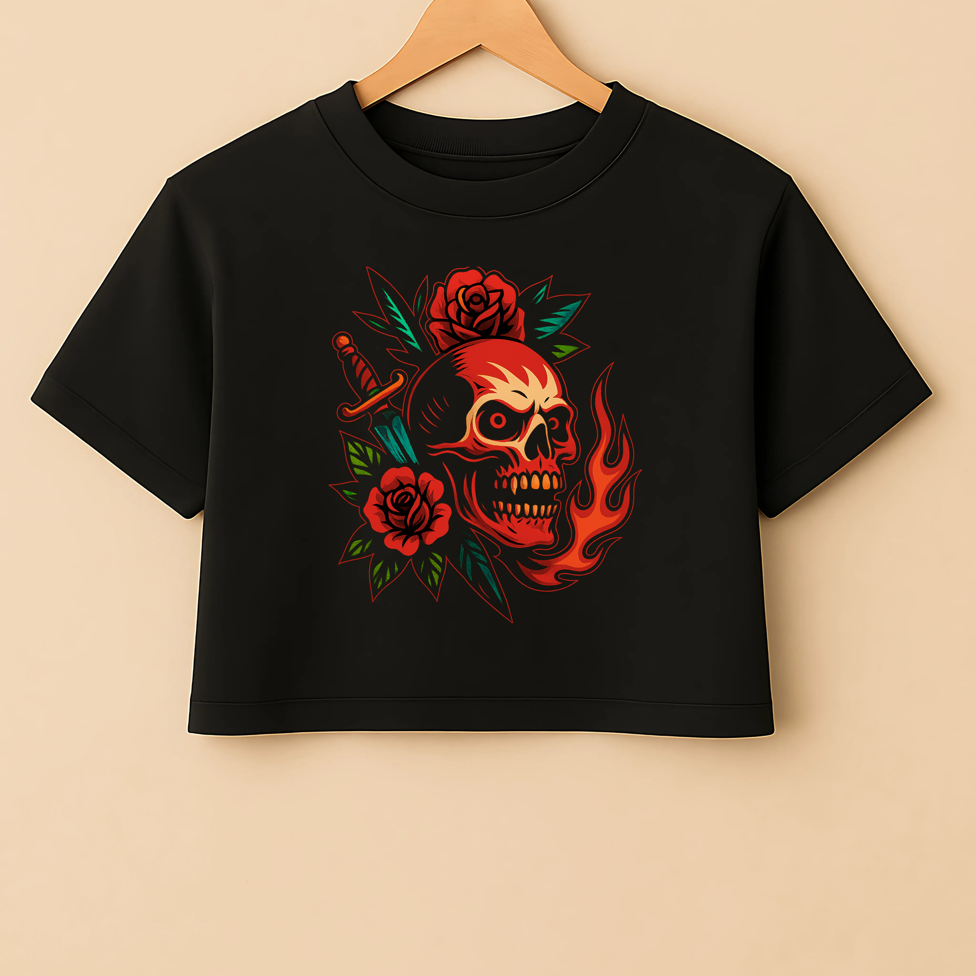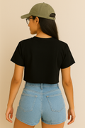 This black crop top fuses contrast and creativity with a powerful abstract front design— It's where sharpness meets softness, chaos meets beauty.